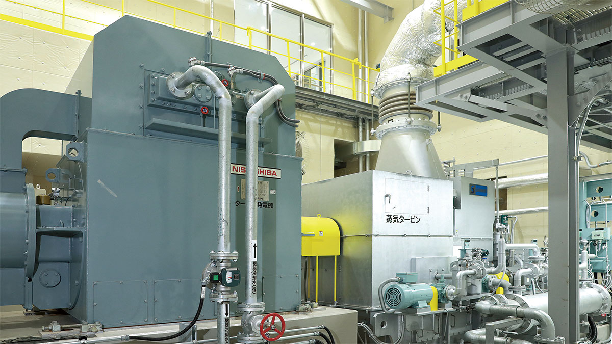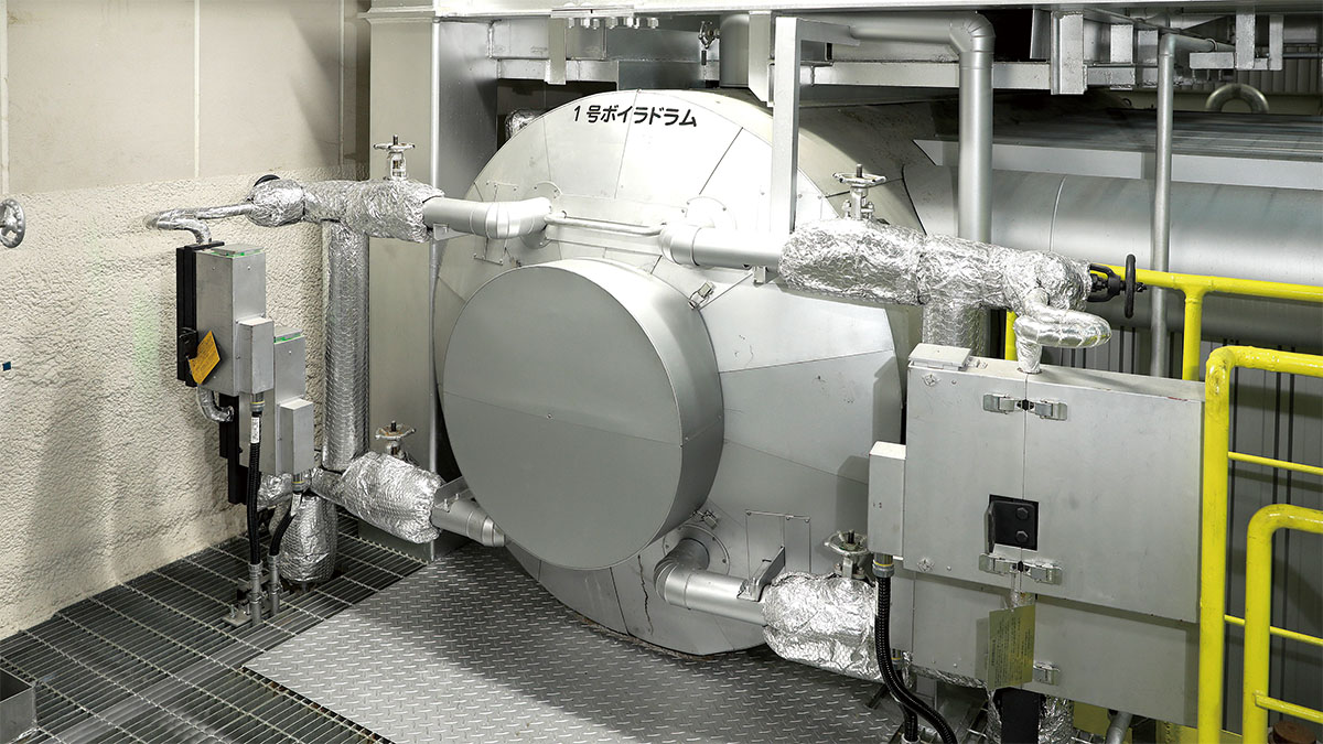 ボイラでは、高温の排ガスから回収した熱で蒸気を発生させます。発生した蒸気は蒸気タービンで発電に利用され、余熱はロードヒーティングに利用されます。